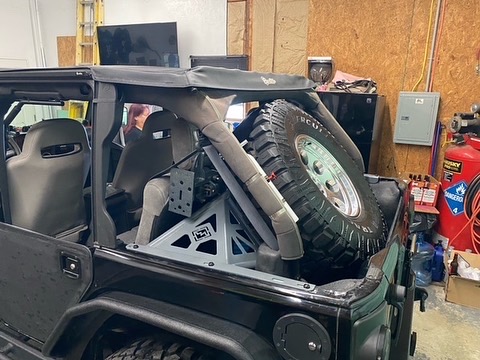 This carrier in the back of a JKU is capable of handling up to a 42x14.50 tire when paired with our 42 kit. If you are running a 37 or smaller, no modifications are needed!