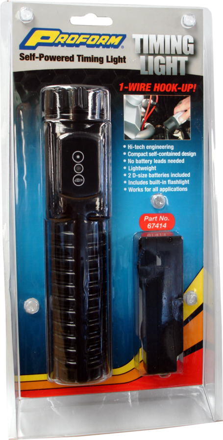 The PROFORM affordable self-powered timing light eliminates the difficulty of setting your ignition timing. Each light weight designed unit comes standard with 2 D-size batteries, built-in flashlight, spare bulb, and protective rubber bezel. No battery leads needed, so it is very easy to use! Effortless 1-wire hookup, simply connect slide trigger open, place over the number 1 wire, close it and you are ready to time your engine! Sold individually.