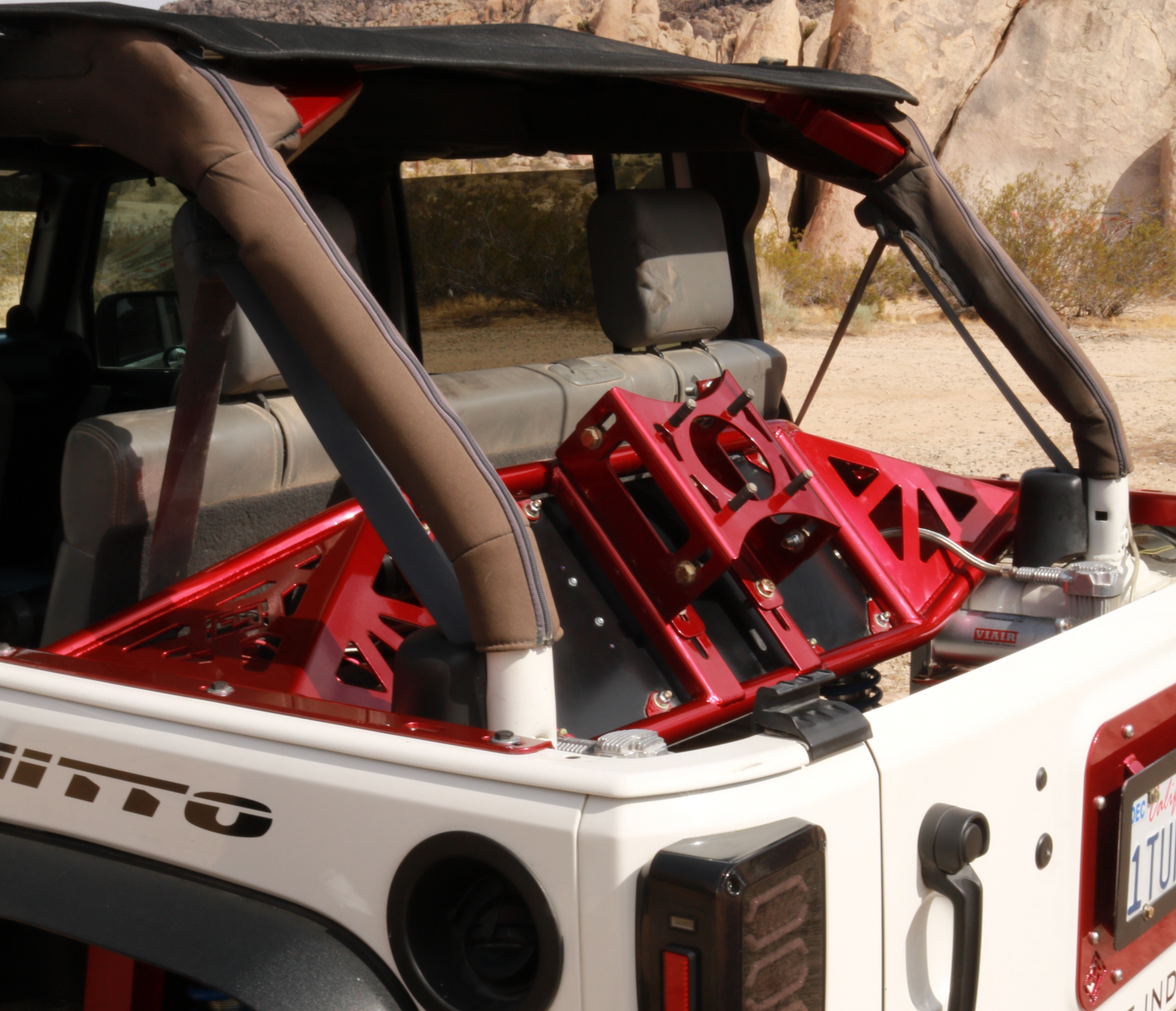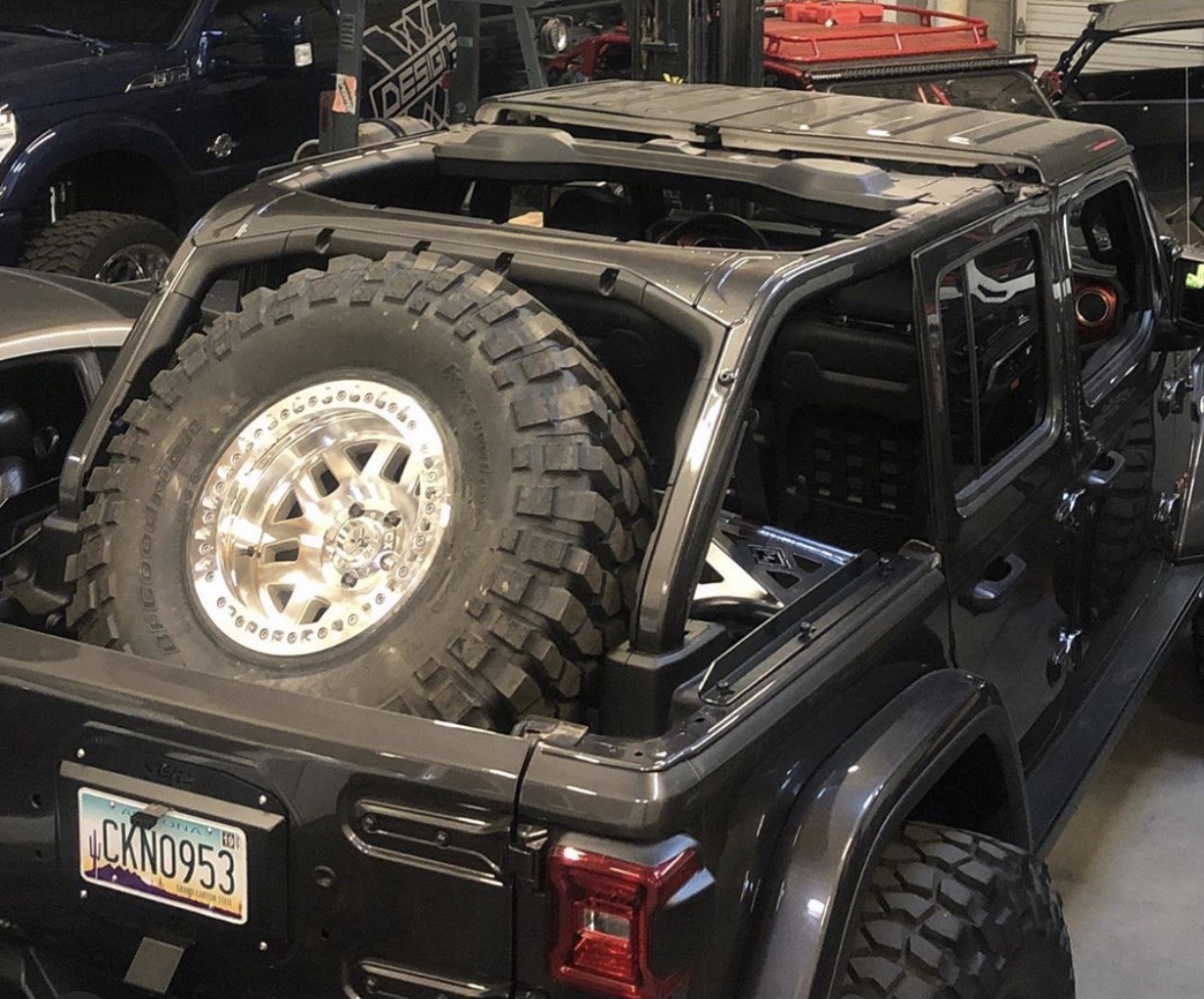This carrier in the back of a JKU is capable of handling up to a 42x14.50 tire when paired with our 42 kit. If you are running a 37 or smaller, no modifications are needed!(GoodYear MTR's and Nitto Mud Grapplers will require trimming of the plastic and foam that surrounds the rear upper cage crossmember for proper fitment)