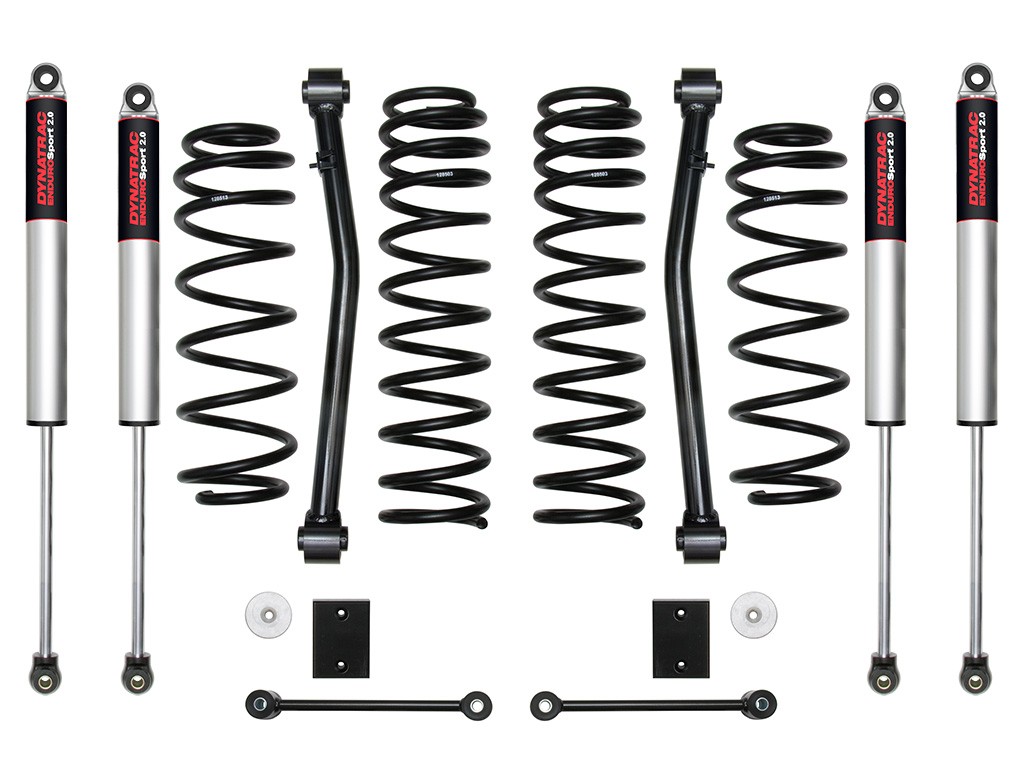 This system includes 3 inch lift dual rate coil springs, 2.0 EnduroSport shocks, tubular steel front lower links, bump stop spacers, sway bar links, and all necessary hardware to complete the installation. With this combination of components, Dynatrac was able to increase wheel travel numbers by 3 inch in front and 2 inch in the rear, significantly improving the performance of the 2018-2023 JL.