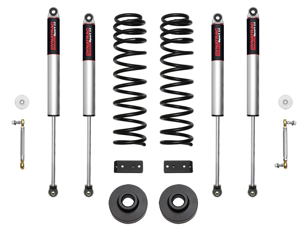 This system includes 3 inch lift front dual rate coil springs, 1.38 lift billet aluminum rear coil spacers, 2.0 EnduroSport shocks, bump stop spacers, adjustable front sway bar links and rear brackets, and all necessary hardware to complete the installation. With this combination of components, Dynatrac was able to increase wheel travel numbers by 3 inch in front and 2 inch in the rear, significantly improving the performance of the 2020-Up JT.
