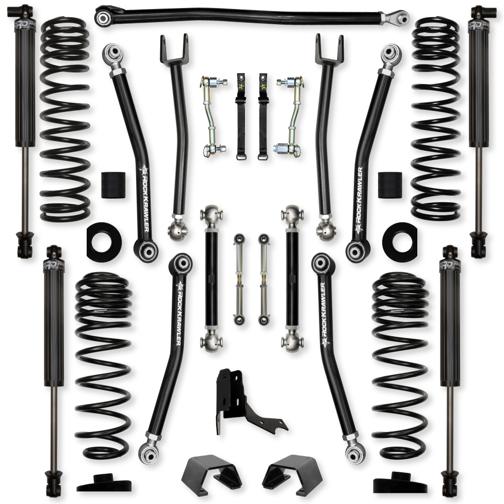 The coil itself is built with the proper Free-length for off-road articulation and stays firmly seated in the coil bucket (as long as a proper length shock is installed), and overall has a very controlled reaction to bumps, rocks, sand, mud and whatever else you can manage to throw at them! All Rock Krawler JL/JT systems include correction pads that reduce the spring bow inherent in the factory setup.