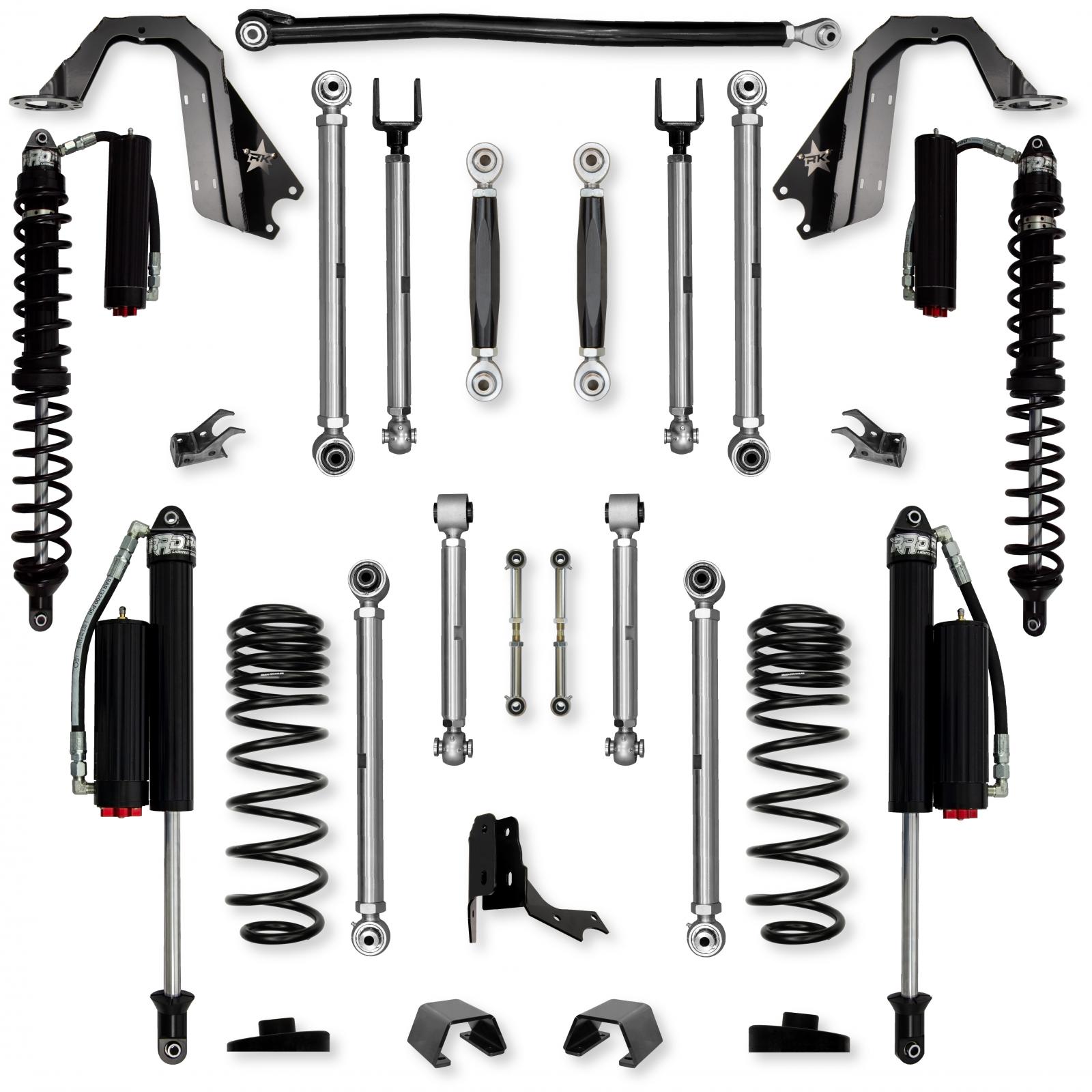 Rear coilovers perform amazing off road, but do not take changes in loading conditions too well so towing or adding a lot of weight to the bed area is not optimal for rear coilovers. The standard or Stage 1 System features 2 5/8 RRD Racing Coilovers w/Remote Reservoirs front and for a well tuned package.