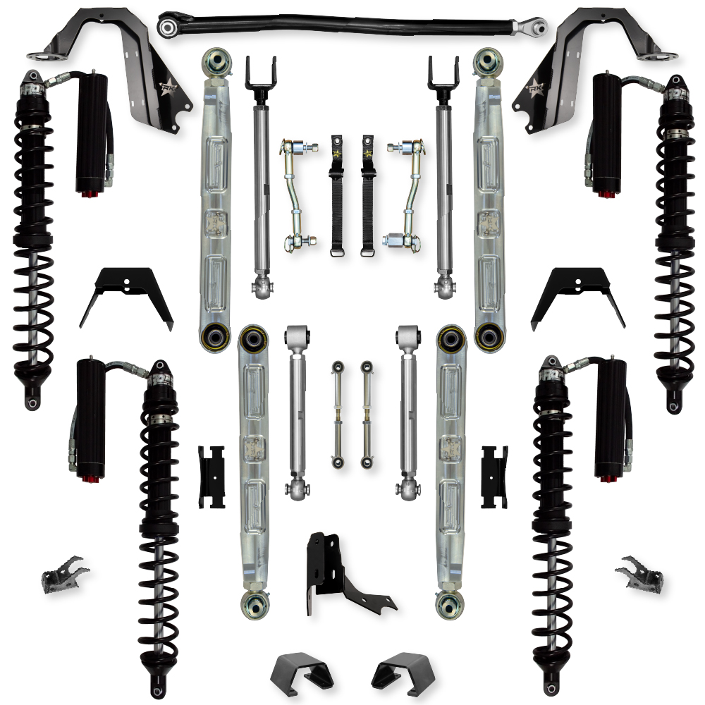 The Rock Krawler 3.0 X-Factor Pro Elite Coilover Mid-Arm Diesel System is specifically designed for Sport/Overland owners who want a complete system, bolt-in installation, and the best articulation of any mid-arm kit on the market. The lower control arms are our signature PB+J (Pure Beef and Jealousy) mid arms machined from 2 inch x 3 inch billet 7075 Aluminum.