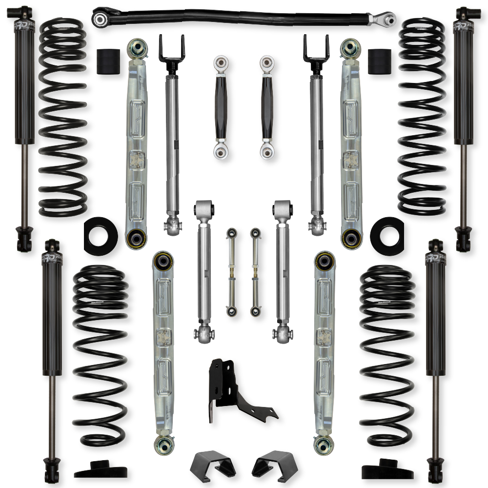The provided track bar geometry corrections, both front and rear, letting you perfectly center the axles so there is no compromise in on-road handling. When we design a system, our goal is to provide you with the most comprehensive solution and the best geometry, install exceptional value, and be the foundation for every adventure whether it be on the Street, in tow or down a trail!