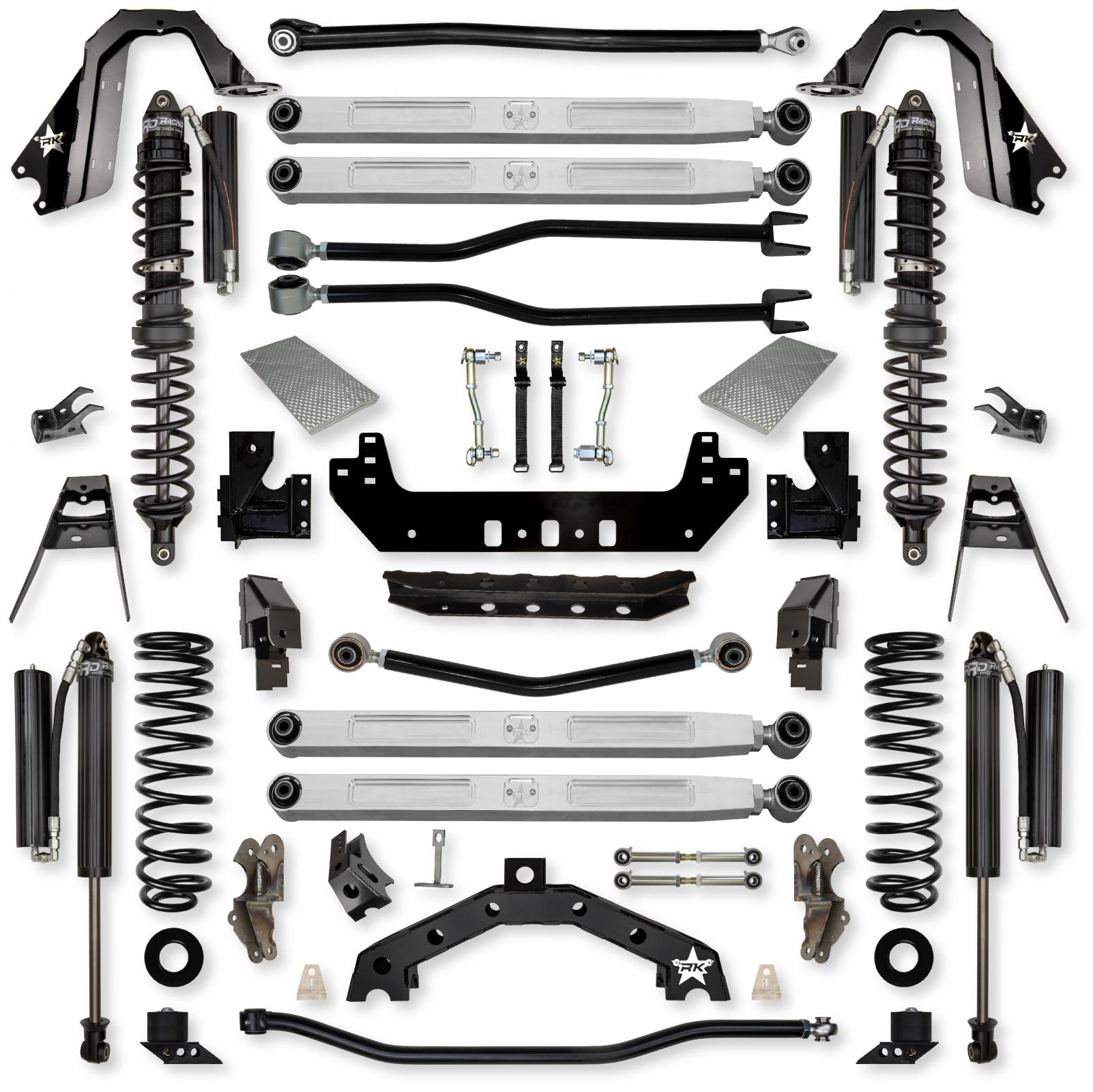 Rear coilovers perform amazing off road, but do not take changes in loading conditions too well so towing or adding a lot of weight to the bed area is not optimal for rear coilovers. The standard or Stage 1 System features 2 5/8 RRD Racing Coilovers w/Remote Reservoirs front and for a well tuned package.