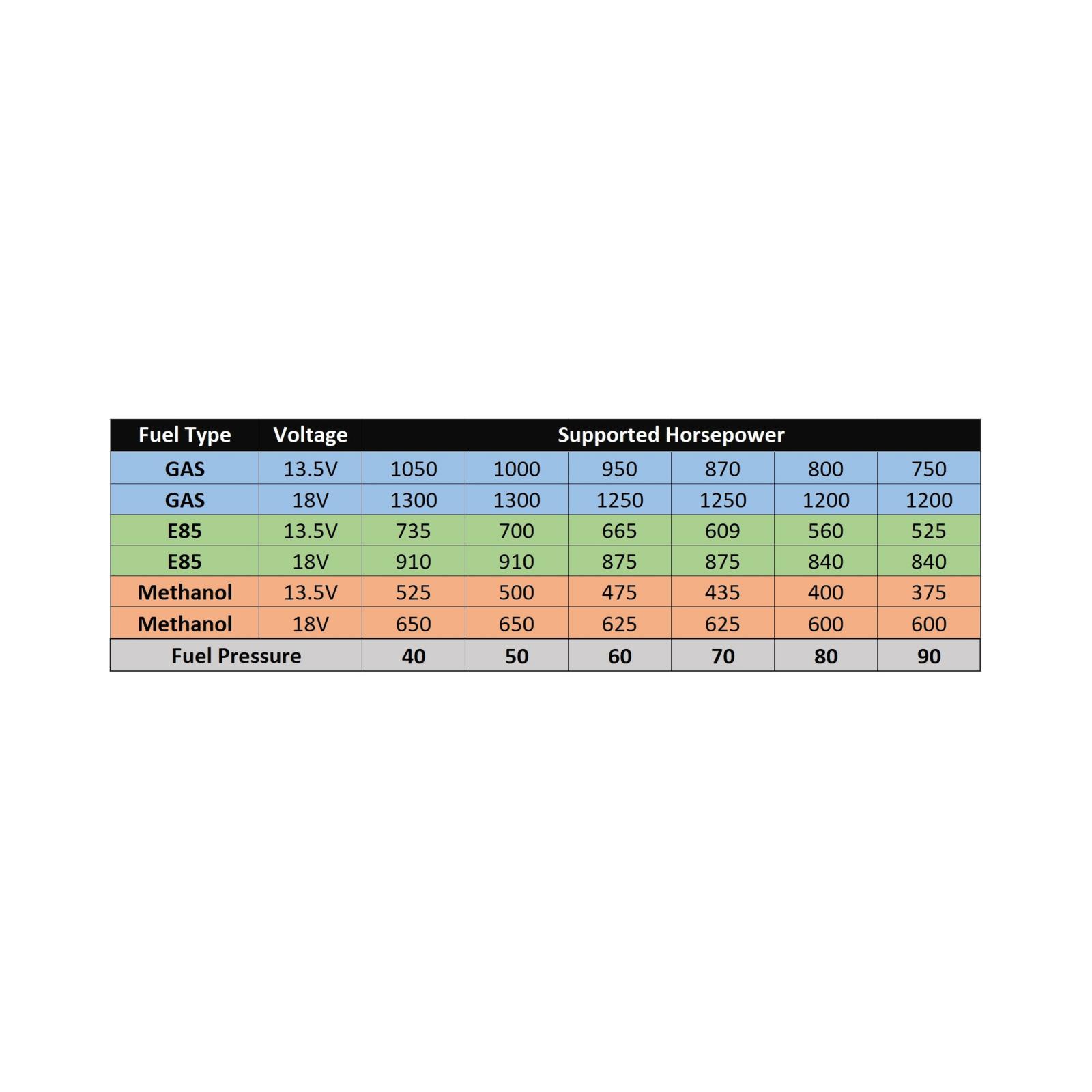 Each pump is individually flow tested and guaranteed to flow 400+ LPH (106 GPH) at 40 PSI (13.5V), which on gasoline will support 1000+ horsepower!