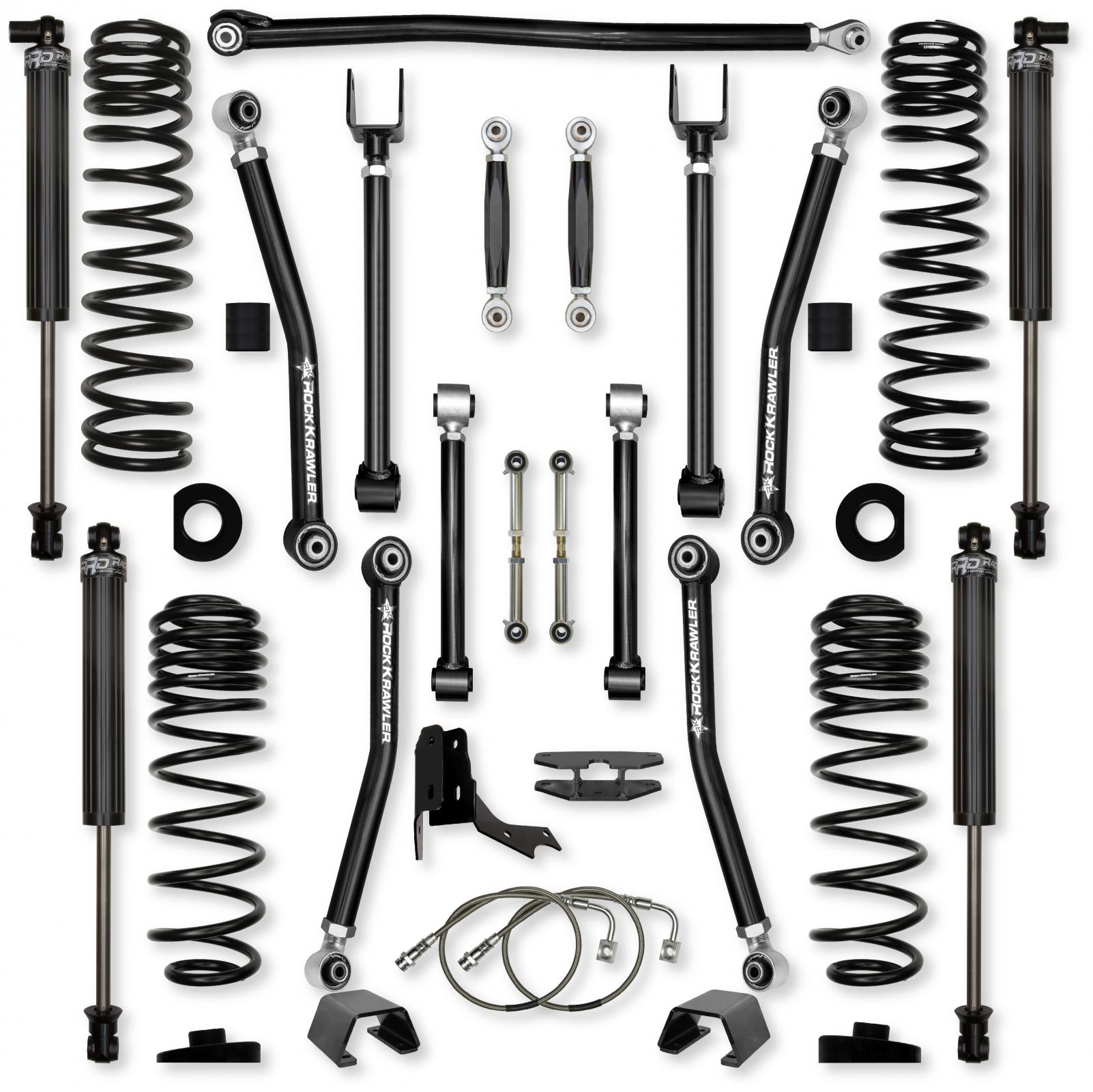 The Rock Krawler 4.5 Adventure - X No-Limits Mid-Arm System is specifically designed for Rubicon owners who want a complete system, bolt-in installation, and some of the best articulation of any mid-arm kit on the market. Our system proves its durability and off-road performance every time you hit the streets or trail! The term Adventure - X comes from the inclusion of 8 adjustable control arms with our 100 percent service-free Adventure Series joints installed.