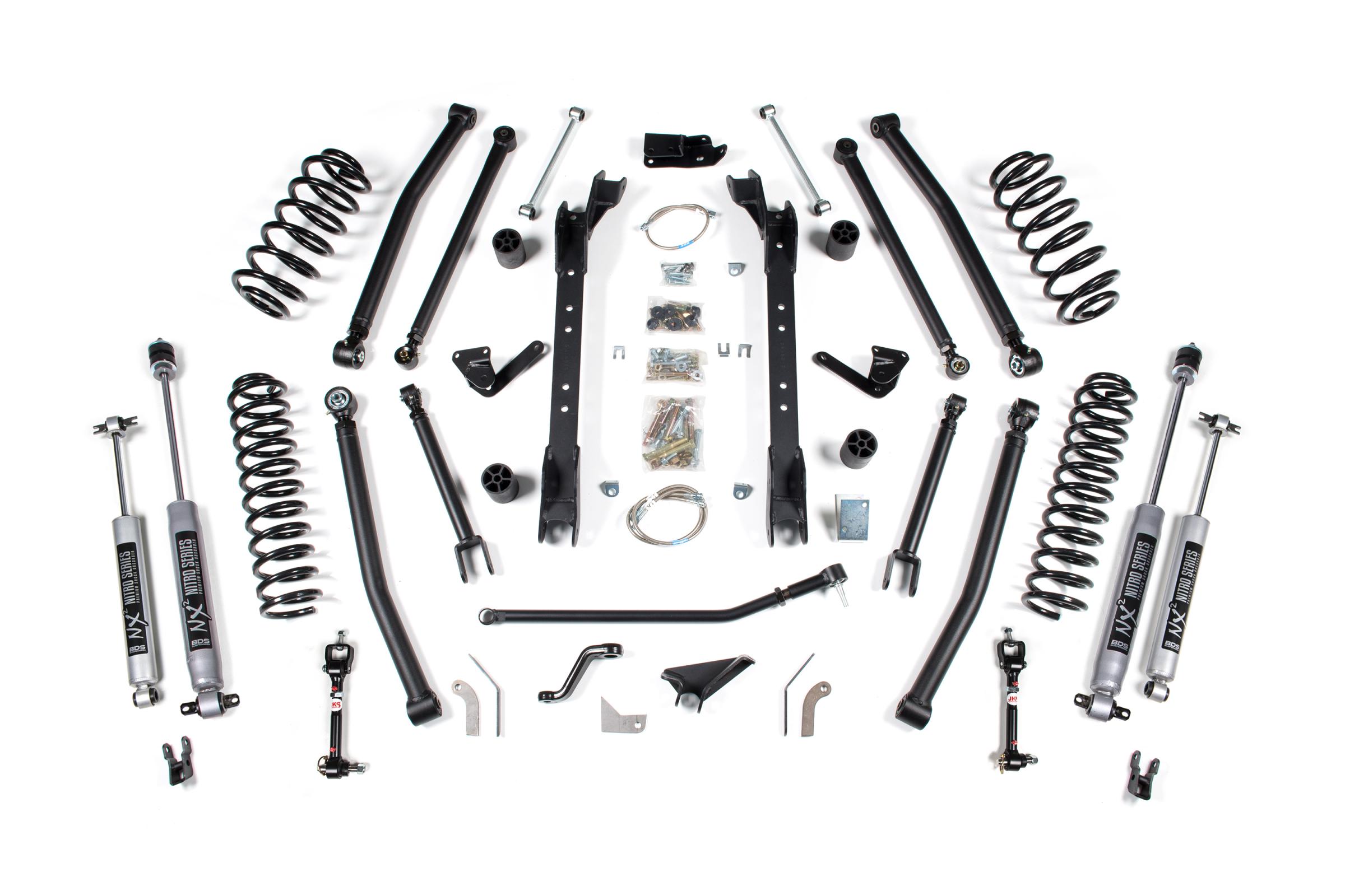 Maximize the capability of your 1996-2003 Jeep Wrangler TJ with this 4.5-inch lift kit with long arm conversion from BDS Suspension. Designed to improve stance this kit includes everything necessary to set your Jeep up right with clearance for up to 33 inch Tires.