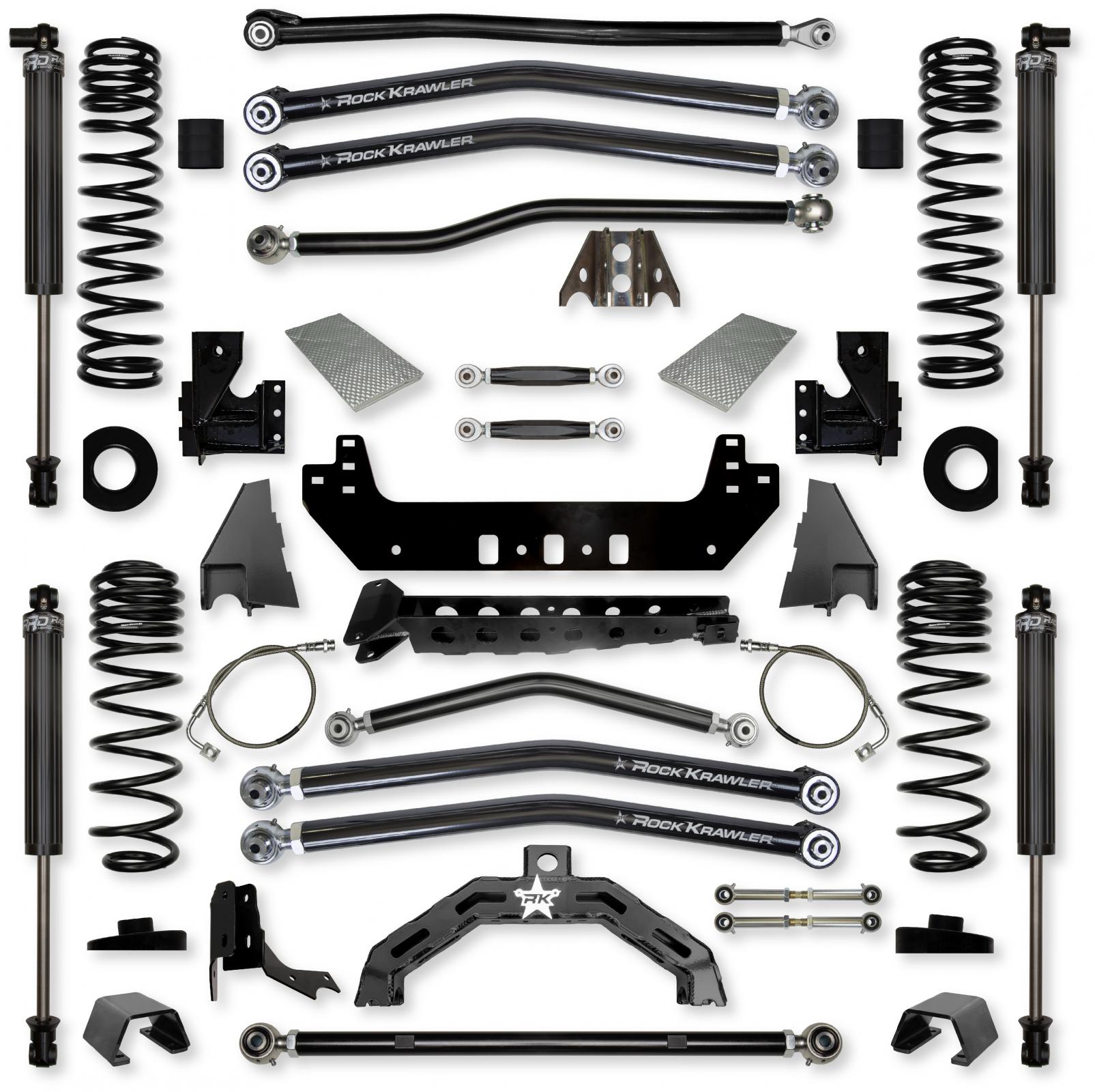 The Rock Krawler 4.5 X-Factor X2 No-Limits Long-Arm System is specifically designed for Gladiator owners who want to push their vehicle to its limits with hard core rock crawling. No-Limits comes from the inclusion of our front sway bar links specifically designed for use with the factory electronic sway bar disconnect feature found standard in your Rubicon Gladiator!