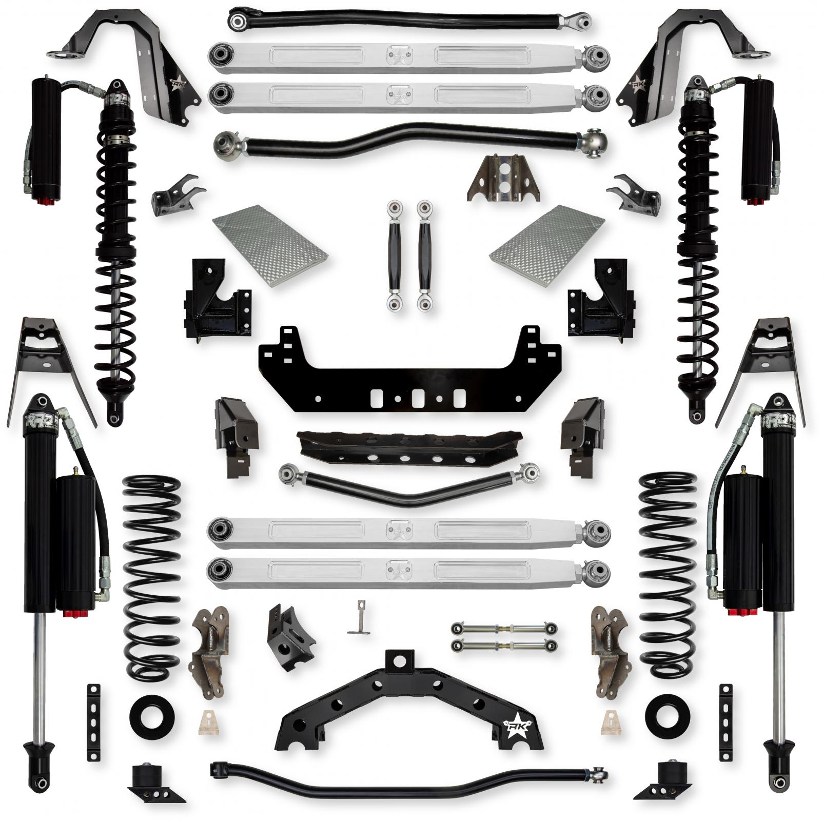 Rear coilovers perform amazing off road, but do not take changes in loading conditions too well so towing or adding a lot of weight to the bed area is not optimal for rear coilovers. The standard or Stage 1 System features 2 5/8 RRD Racing Coilovers w/Remote Reservoirs front and for a well tuned package.