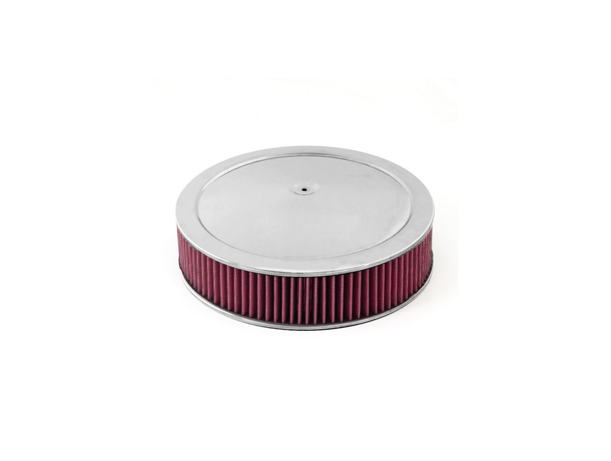 This 14 inch round chrome air cleaner assembly from Rugged Ridge fits most 4-barrel carburetors. Our dry panel design never needs oiling, which prevents your mass airflow sensor from being damaged by excess oil!