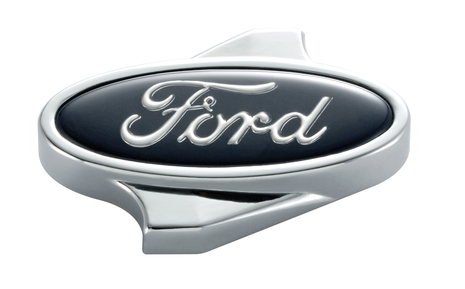 - Features Black Ford Oval Logo In Chrome Finish And Script