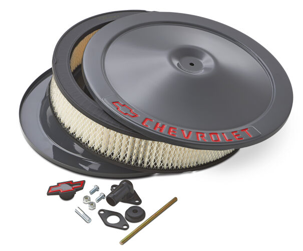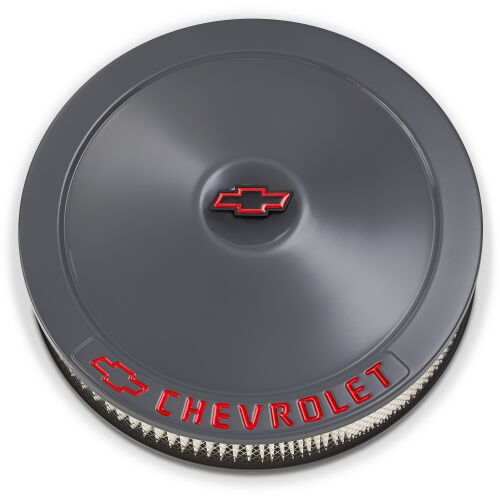 Shark Gray is our latest engine dress-up finish for Chevrolet Performance. Why not complete your engine compartment with a premium 14 inch air cleaner kit. Chevrolet and Bowtie emblems pop with red inlaid paint. Kit includes a black Bowtie air cleaner center nut, and all necessary mounting hardware. This is an officially licensed Chevrolet Performance Parts product. Sold as one complete kit.