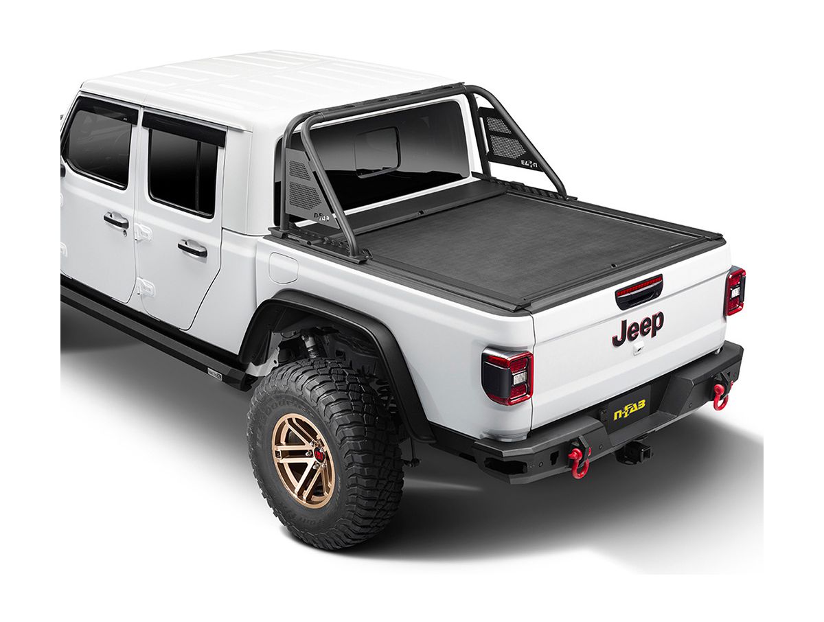 The Armis Retractable Bed Cover with Max Track offers Gladiator owners the convenience of a retracting cover with an added level of capability that's tailor-made for your Jeep. The Armis Retractable starts with a durable vinyl-over-aluminum design that delivers impressive strength and effortless, friction-free operation, not to mention show-stopping good looks, while the security of a precision locking mechanism keeps your bed and gear safe, dry, & secure.