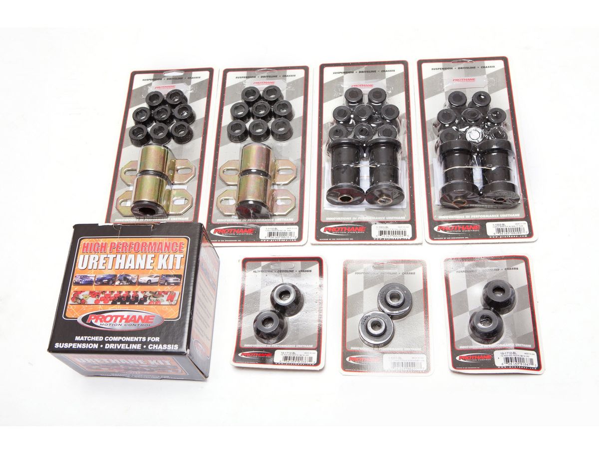 In this Black total bushing kit from Prothane, polyurethane based suspension, driveline and chassis components have been designed as an upgrade to the soft factory rubber components. Precision fabrication ensures a perfect fit.