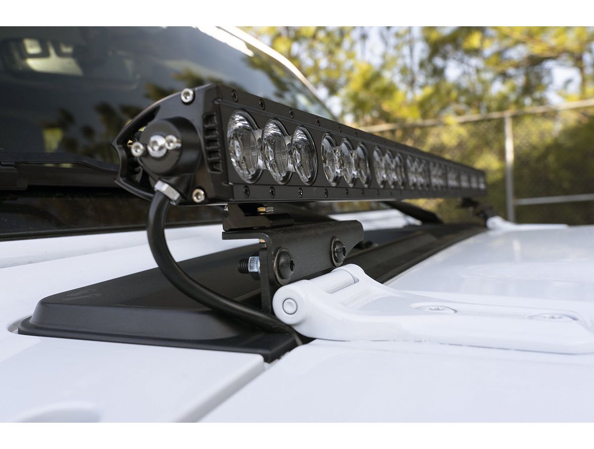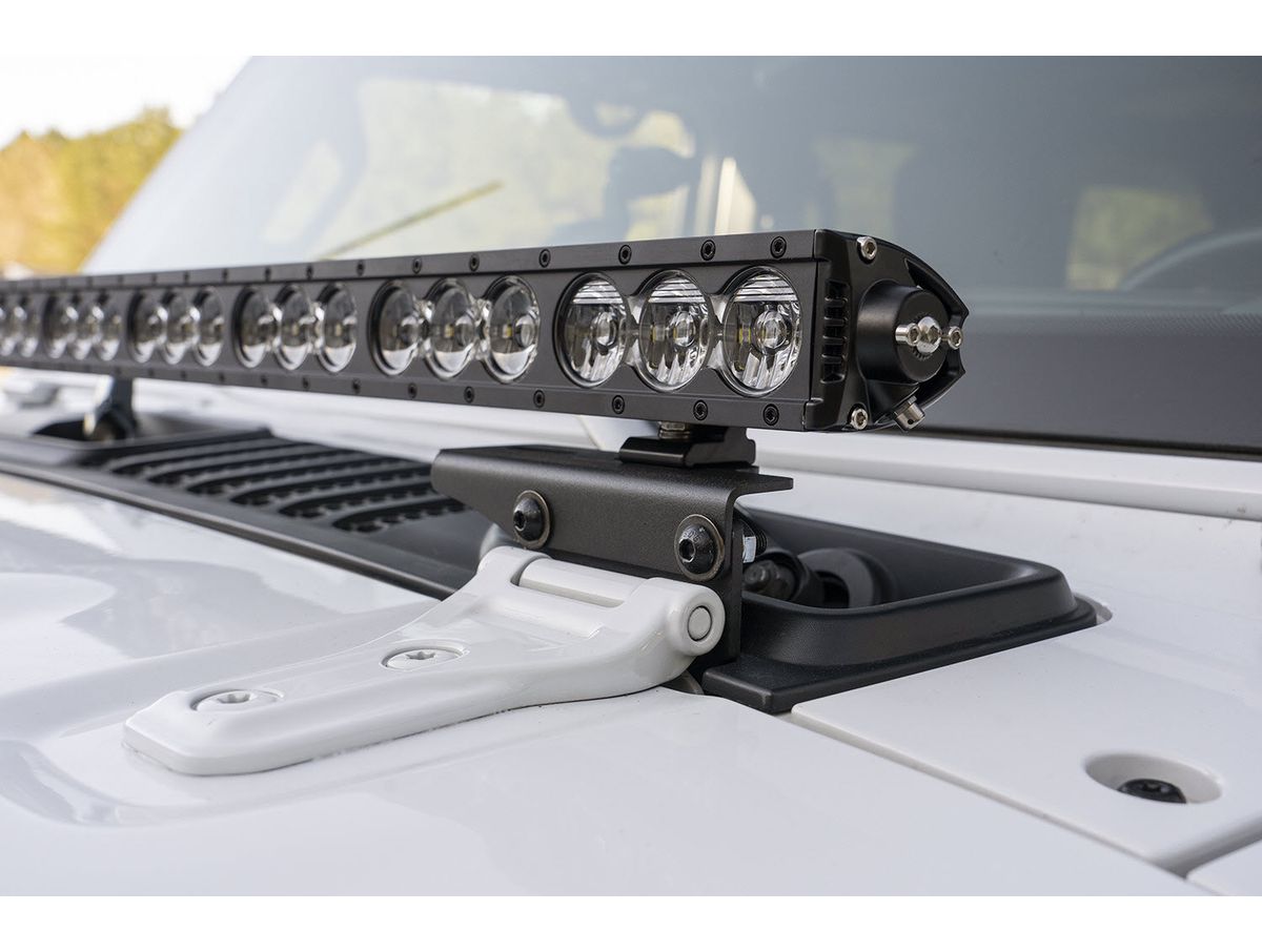 Now Wrangler JL and Gladiator JT owners have a clean and simple way to add LED illumination to their rigs with minimal modification. The Rugged Ridge Cowl Light Bar Bracket Set mounts directly to the hood hinge mounting points on the cowl, an ideal placement for any 40 inch