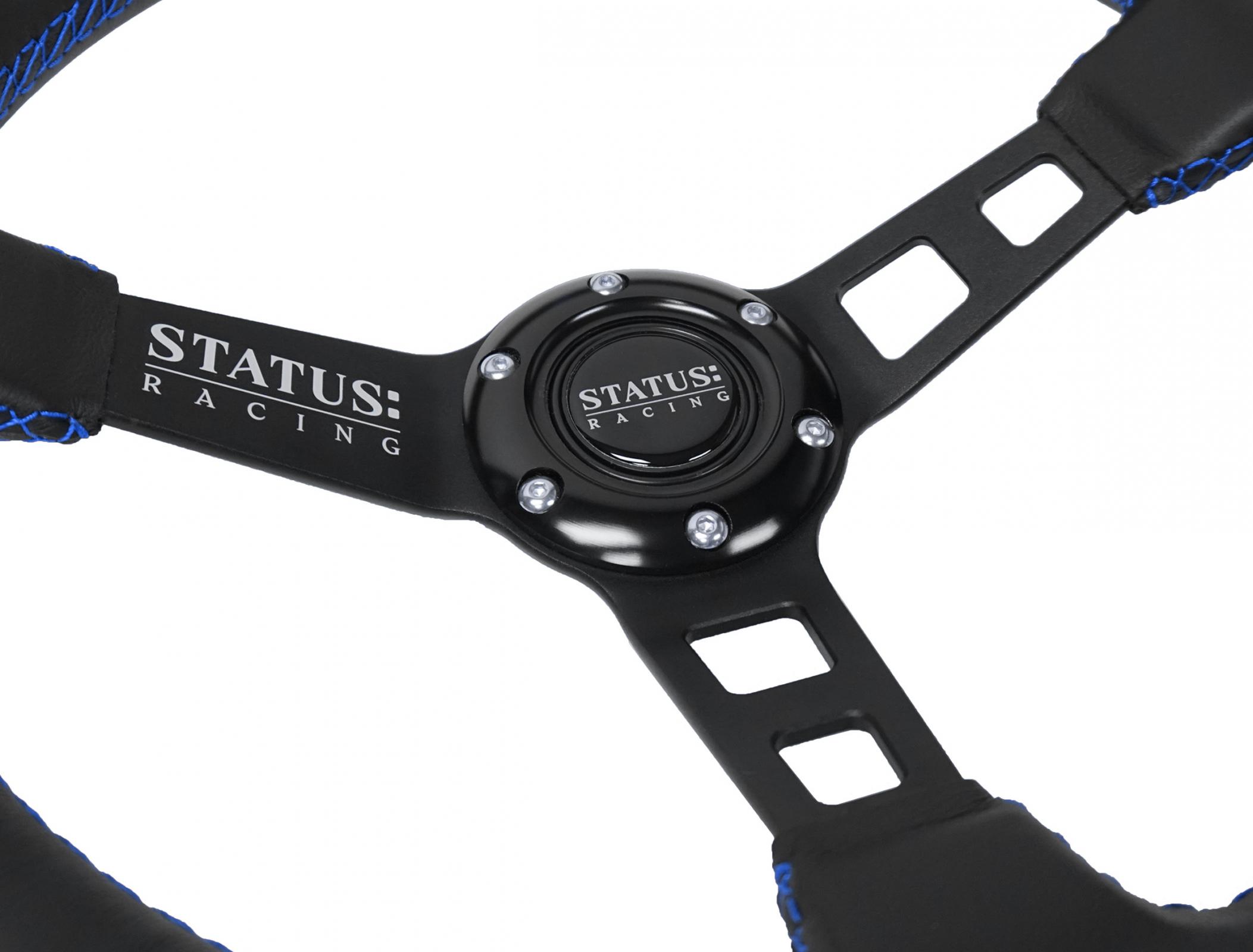 The steering wheel has 6 point bolt pattern, specifically chosen because it fits the majority of aftermarket hubs and quick releases. Includes a center Horn Button with Status emblem.
