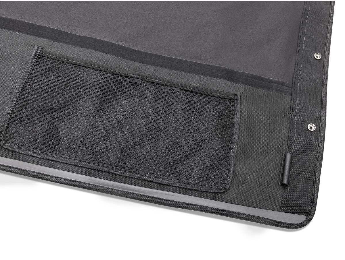 The Montana Bowless Top fits snuggly over the factory roll bar and works with your factory door surrounds and tailgate bar, delivering a uniform weather-tight fitment with an aerodynamic style all its own. Converting to a stylish summer top is as easy as unzipping the rear windows and storing them in the rear window storage fold designed into the top.