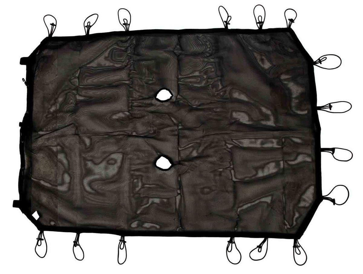 The full-length sun shade is secured between the windshield and the rear crossbar of the JK sport bar to protect both front and rear passengers simultaneously. By using the mesh material with built-in elastic straps, this sunshade was designed from the start to eliminate the need for a header channel as with other similar products.