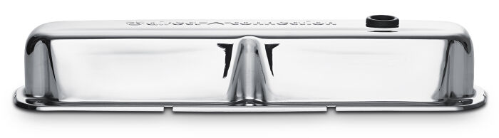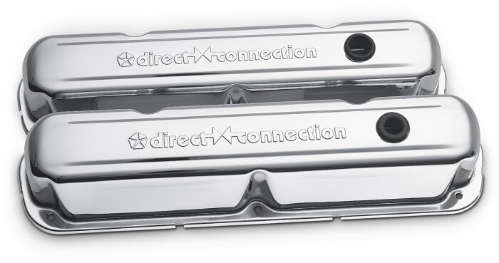 The vintage Direct Connection emblem has been stamped into these valve covers for a nice raised 3D look. Beautiful chrome finish that coordinates nicely with other chrome engine dress-up parts. Oil restricting baffles are pre-installed. All valve covers are sold in pairs, and come equipped with air breather and PCV grommets, unless specified otherwise.