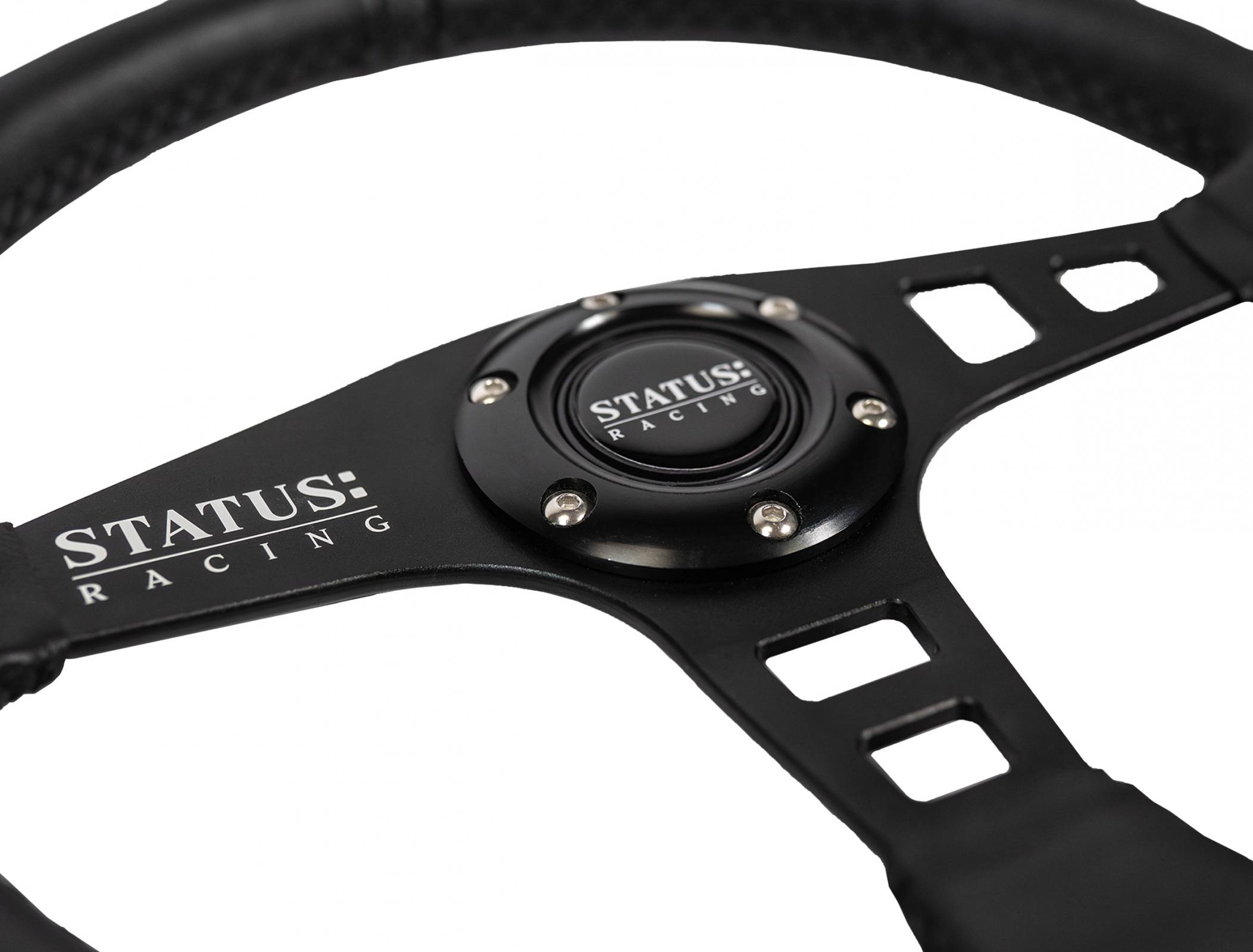 The steering wheel has 6 point bolt pattern, specifically chosen because it fits the majority of aftermarket hubs and quick releases. Includes a center Horn Button with Status emblem.