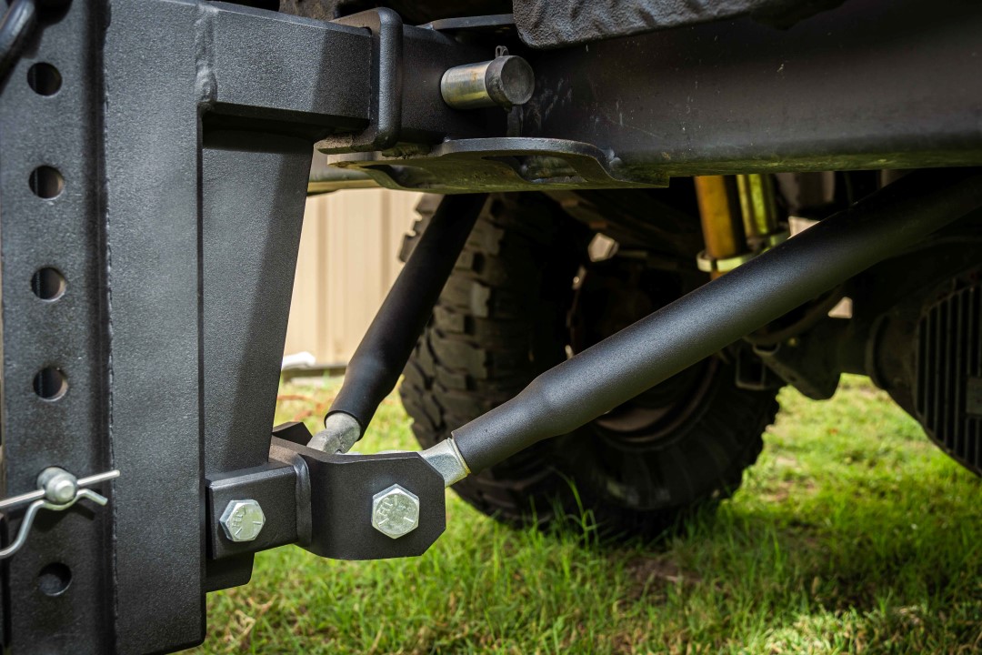 This kit includes two heavy-duty steel bars that connect the bottom of the hitch to the frame rails on the truck. This eliminates all leverage on the trucks hitch receiver.
