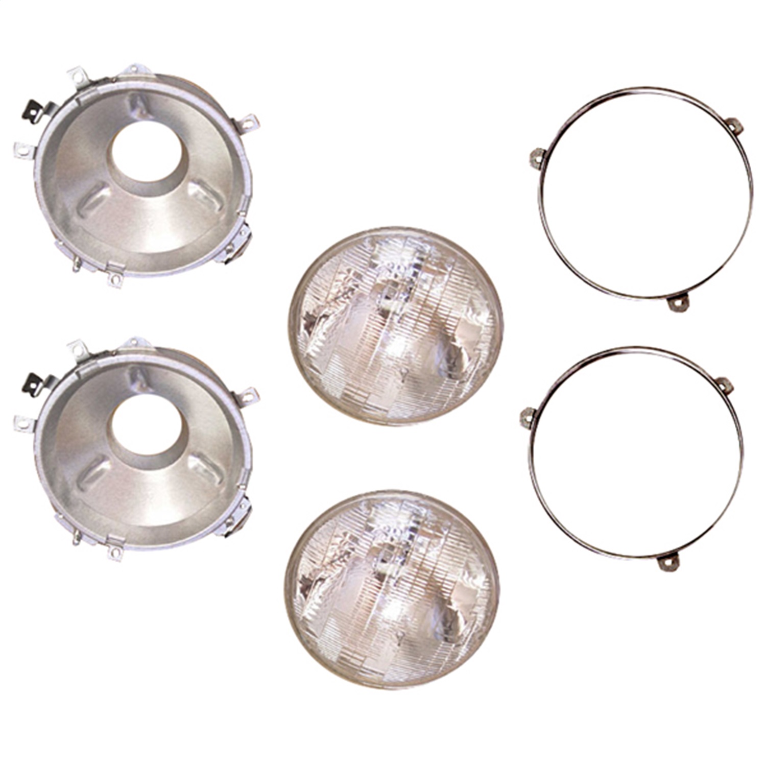 Includes two headlight buckets, two retaining rings and two sealed beam headlight bulbs. For a single headlight assembly, use 12402.01.