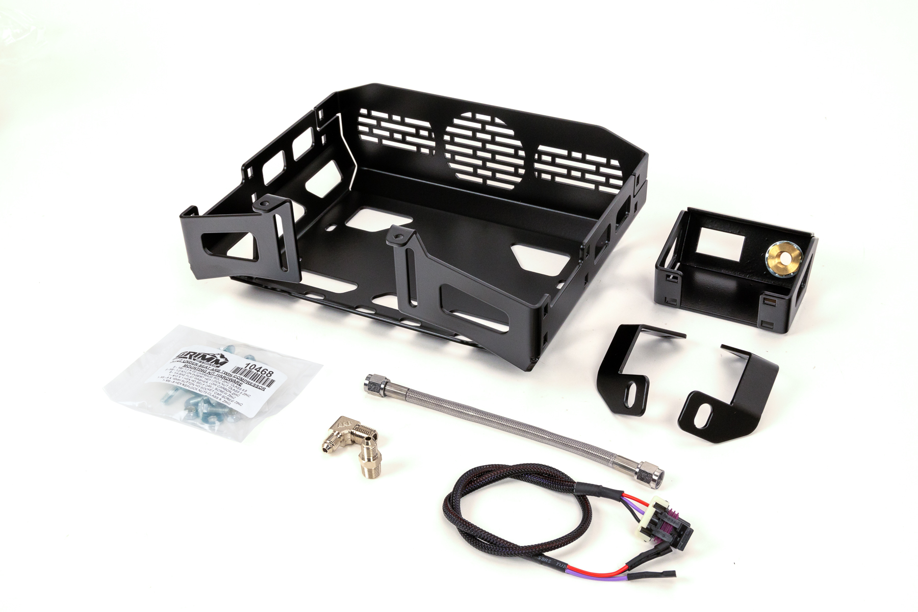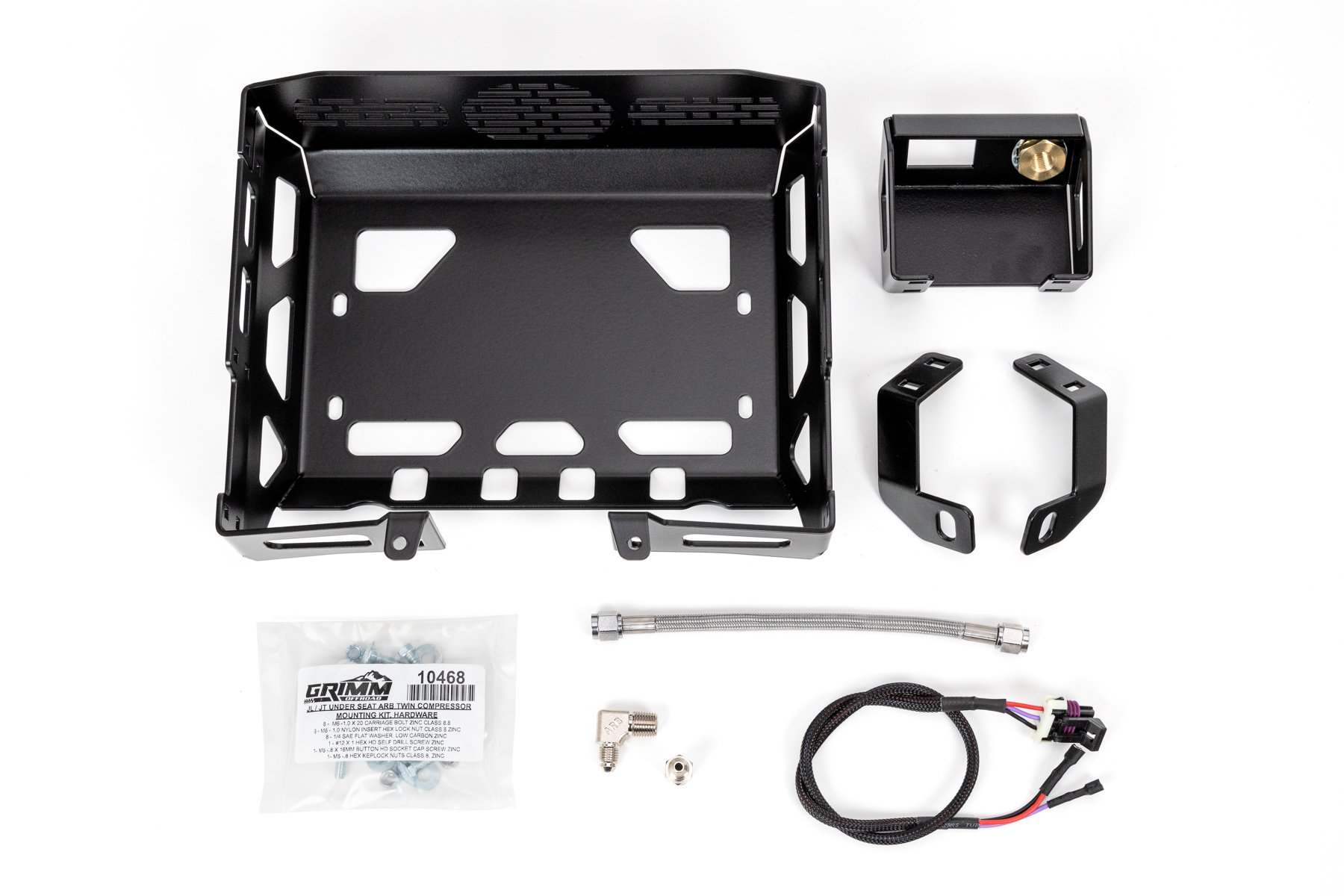 The Grimm OffRoad bracket kit includes four steel brackets, new air line and fittings, and a wiring extender that connects to the compressor's standard harness. Each bracket is made out of steel with a black powder coat finish to protect against corrosion. The larger bracket houses the compressor itself, while two of the smaller brackets locate the compressor for installation and the last bracket mounts the switch and air coupling. Each bracket kit comes with all the necessary fittings, hardware, and instructions you need to get it installed on your Jeep.