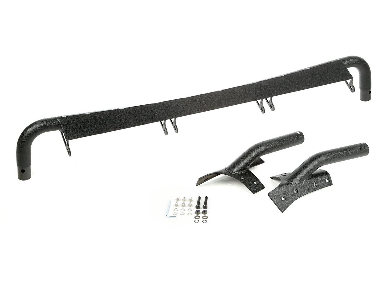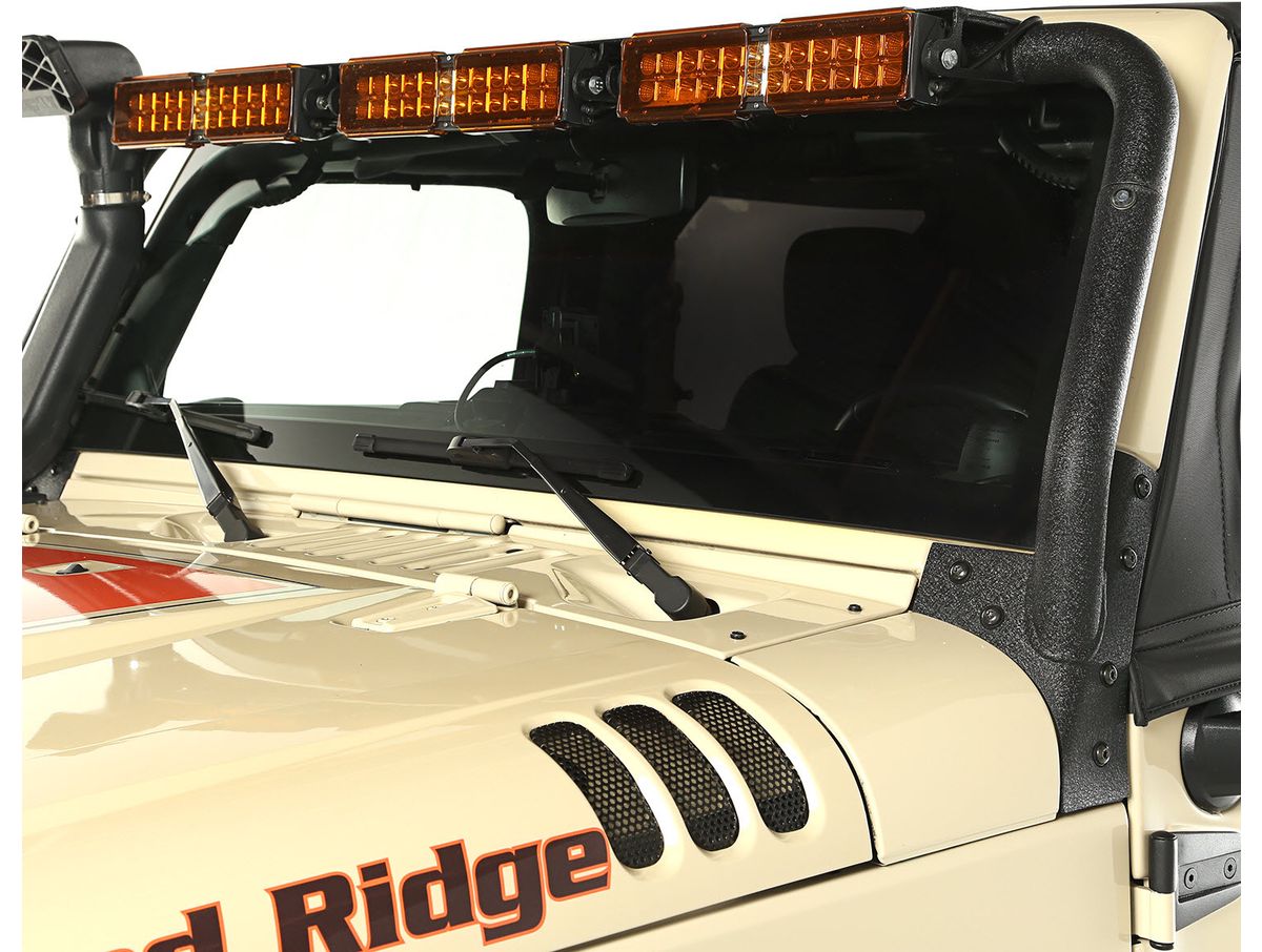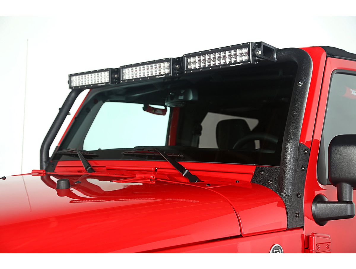 LED Light Bars with low profile tabs; providing flexibility in additional illumination on the trail for nighttime off-roading. The light bar incorporates a special wind deflector to dramatically reduce whistling and buffeting of your soft top.