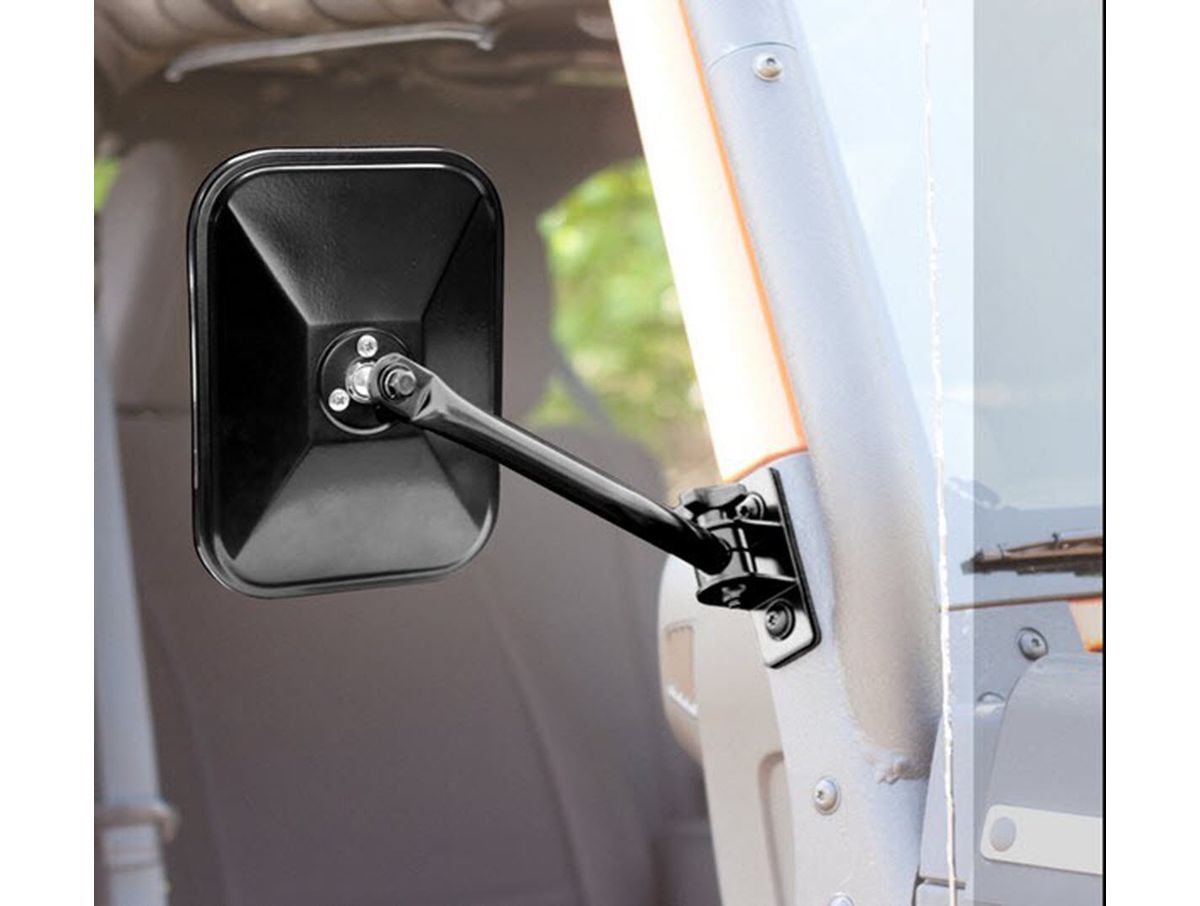 This quick release Black rectangular side mirror from Rugged Ridge offers the perfect mirror solution for the times when you remove your doors! Featuring an easy to use locking knob that offers quick and convenient installation and removal, this mirror mounts to the windshield frame on any side you choose with a simple bolt on solution!