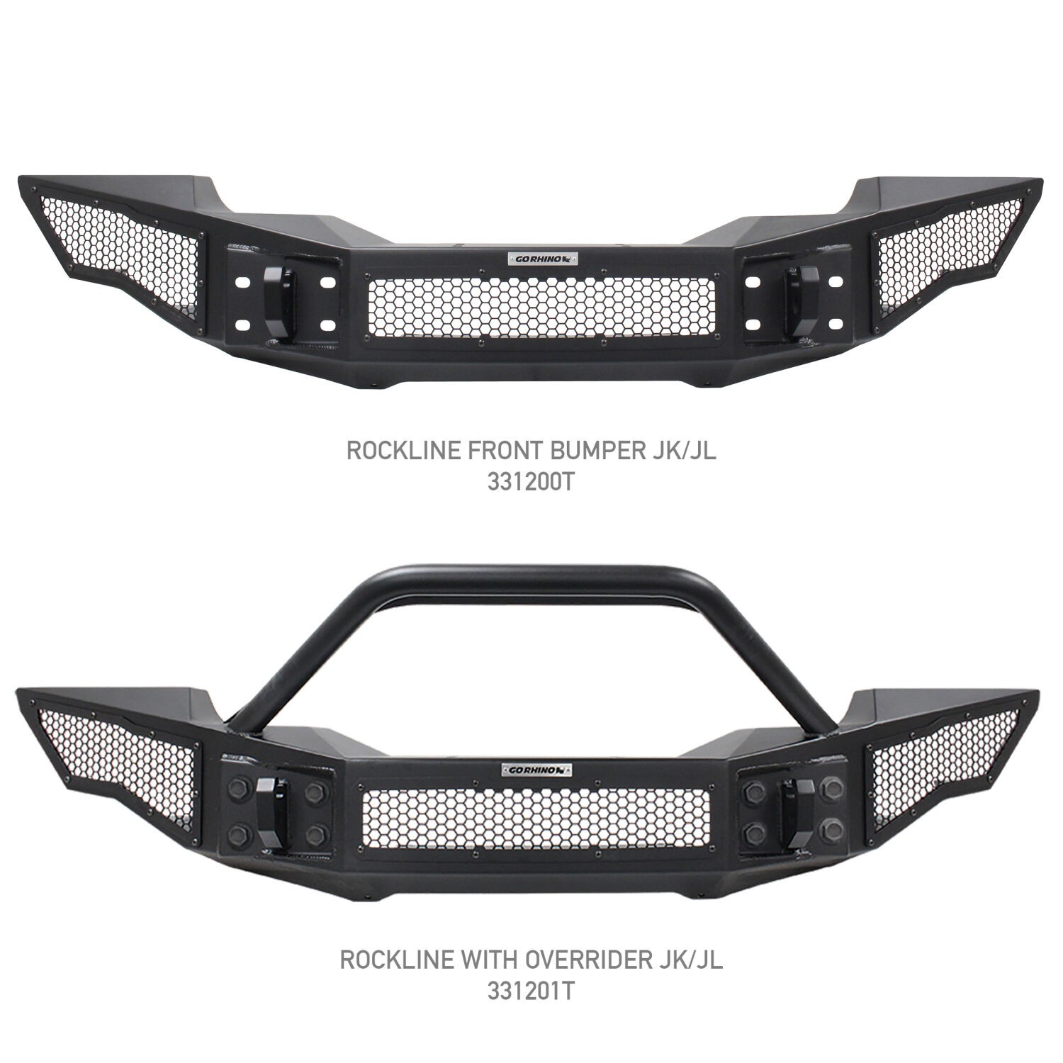 Part of Go Rhino's famous Jeep Bumper family of products. Wrangler JK, JL and JT Rockline Winch Ready Front Full Width Bumper w/ signature hex mesh LED protective cover for use with either an industry standard 20 Inch double row LED bar or up to 4 Inch standard cube LED's.