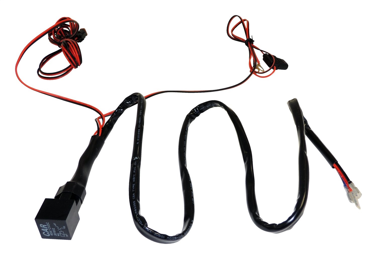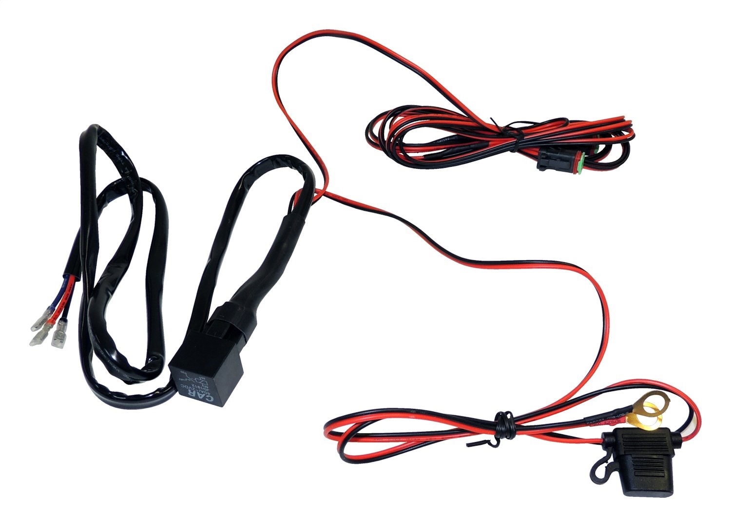 Each harness features Deutsch connectors, a relay w/ bracket, and a switch.