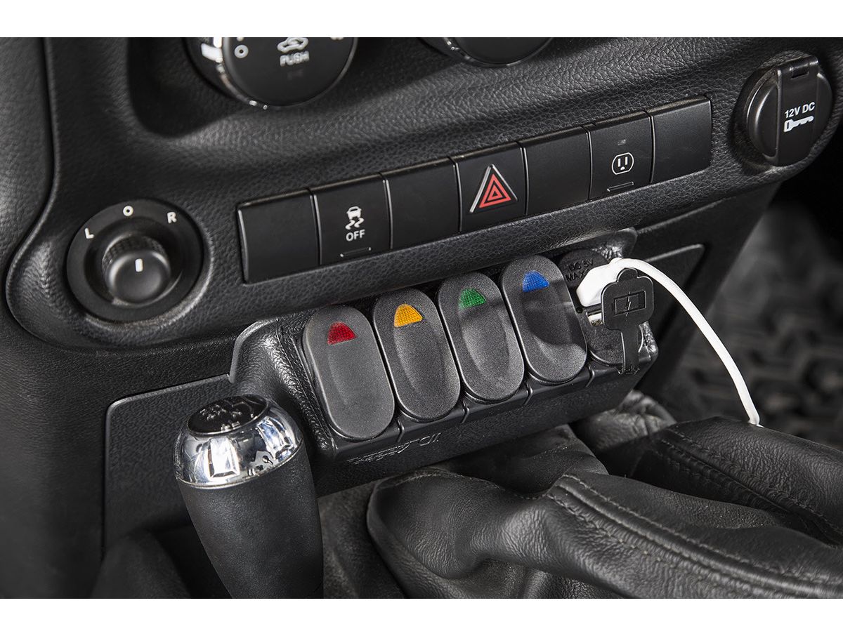 Each Lower Switch Panel Kit includes Four 2-position rocker switches (Amber, Green, Red and Blue) and a nifty Dual USB Charging Port to maintain those essential electronic devices. Switches are ergonomically positioned for easy access and effortless operation in your JK, while maintaining the factory correct appearance.