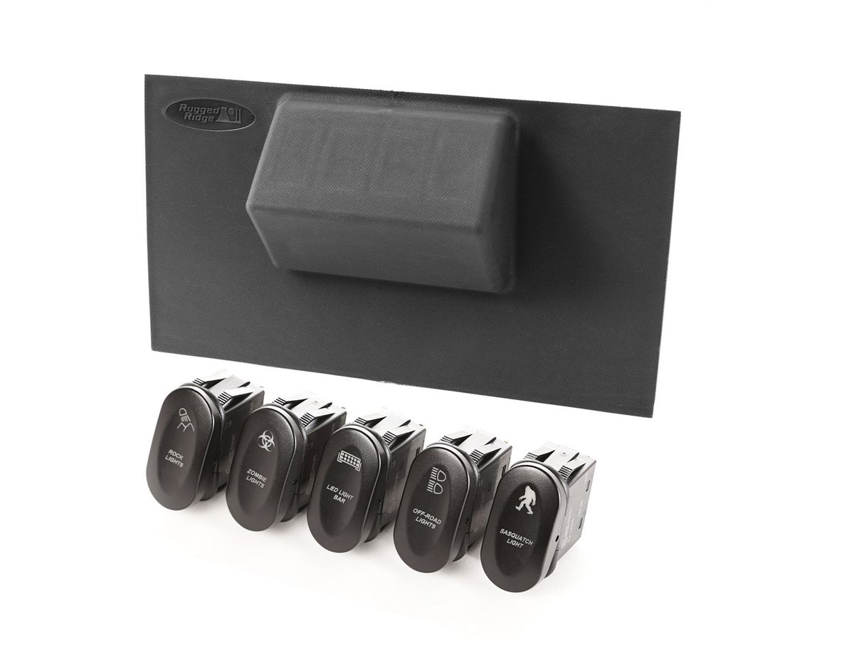 Rugged Ridge Center Console Mount Switch Pod is a direct replacement for the original equipment filler plate on 07-10 Wrangler JK models equipped with Auto transmissions. Each switch panel kit includes the center console switch panel and Five 2-position Laser-Etched Rocker Switches (Zombie Lights, Light Bar Lights, Sasquatch Lights, Rock Lights and Off-Road Lights).