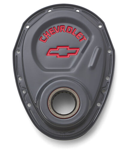 This Shark Gray timing chain cover has distinctive recessed Bowtie and Chevrolet Emblems with inlaid red paint. For long-term corrosion resistance the cover is electrostatically painted and baked with a durable gray epoxy.