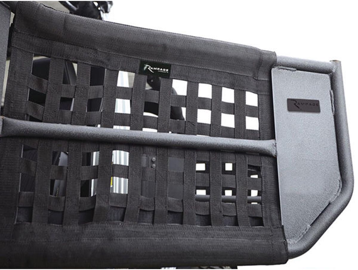 Get the feel of the trail while staying protected with Trail Doors from Rampage(TM) Products. Adventure-worth attributes included thick steel safari-style construction with a textured black powder coated finish, removable netting, and easy-to-open handles.Installs easily with adjustable hinge pins and latch plates.