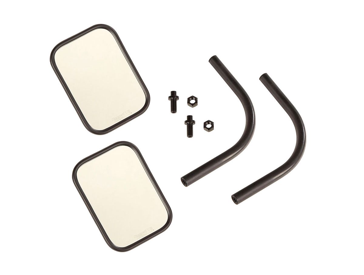 Each mirror assembly is finished with a durable and attractive Tough Satin Black Powder Coat finish and includes all the necessary hardware for installation. Choose from a traditional rectangular mirror head or a round mirror for a more retro appearance.